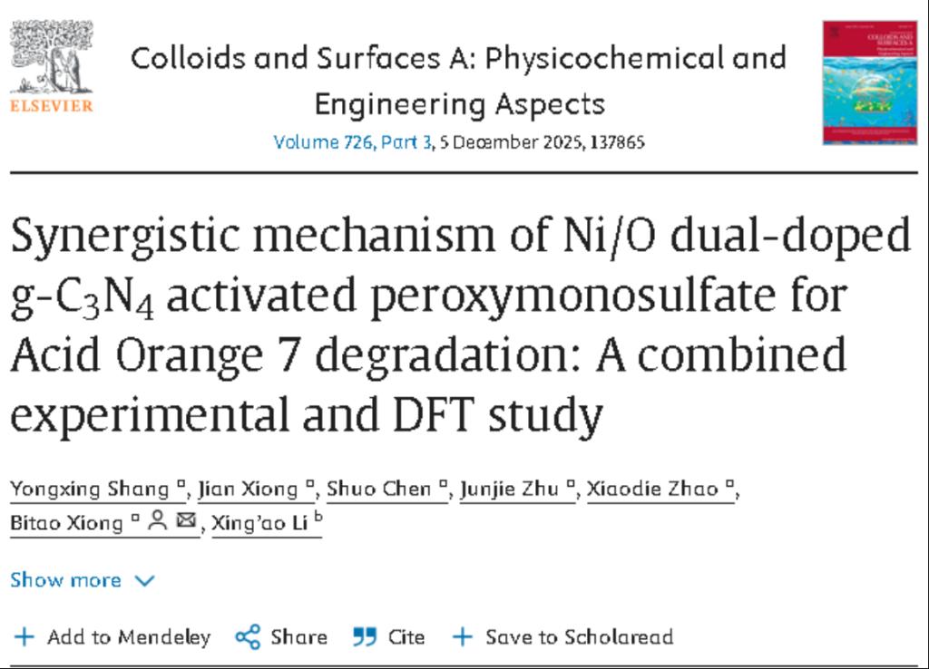应用物理2022级本科生商永兴以第一作者身份在《Colloids and Surfaces A: Physicochemical and Engineering Aspects》期刊上发表了题为“Synergistic mechanism of Ni/O dual-doped g-C3N4 activated peroxymonosulfate for Acid Orange 7 degradation: A combined experimental and DFT study”的科研文章。草榴社区