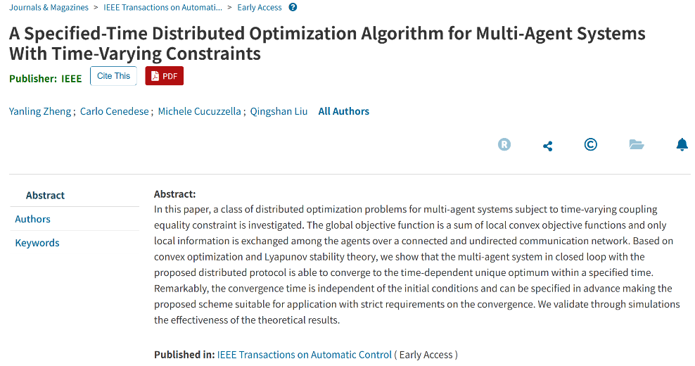 动力系统与可积系统团队郑燕玲博士与合作者在控制领域国际顶级期刊 《IEEE Transactions on Automatic Control》(IEEE TAC)上发表论文 “A Specified-Time Distributed Optimization Algorithm for Multi-Agent Systems With Time-Varying Constraints”(点击阅读)。郑燕玲博士为第一作者,苏黎世联邦理工学院高级研究员Carlo Cenedese 为第二作者,荷兰格罗宁根大学Michele Cucuzzella 教授和东南大学刘庆山教授为共同通讯作者,草榴社区