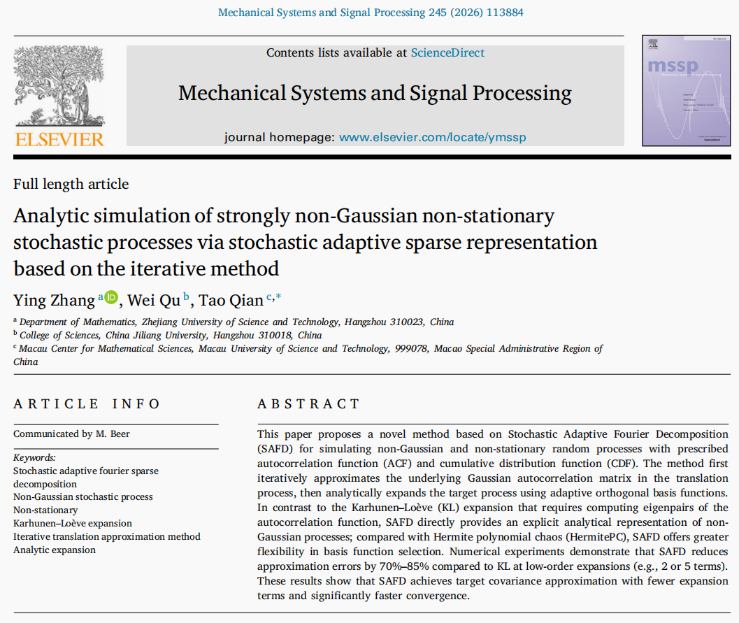 实分析与调和分析及应用团队张影博士与合作者在非高斯随机过程模拟与信号分析领域取得重要研究进展,相关成果发表在国际权威期刊《Mechanical Systems and Signal Processing》(简称MSSP,中科院一区Top,影响因子为8.9)。研究成果以张影博士为第一作者,草榴社区