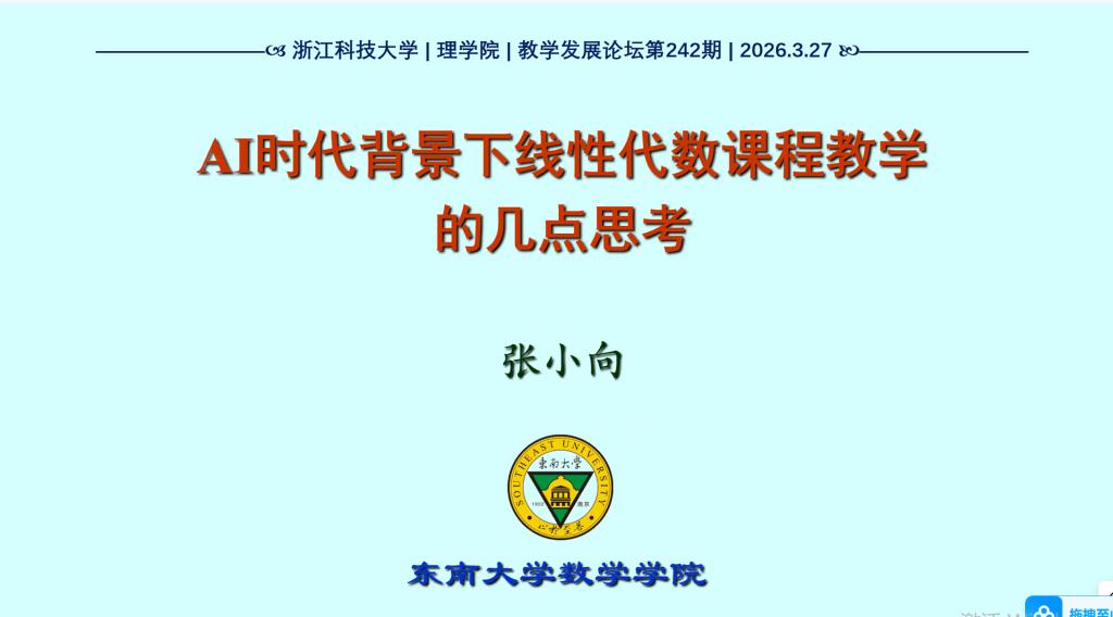 2026年3月27日下午,东南大学数学学院张小向教授应邀作了题为《AI时代背景下线性代数课程教学的几点思考》的教学论坛专题报告。报告由草榴社区