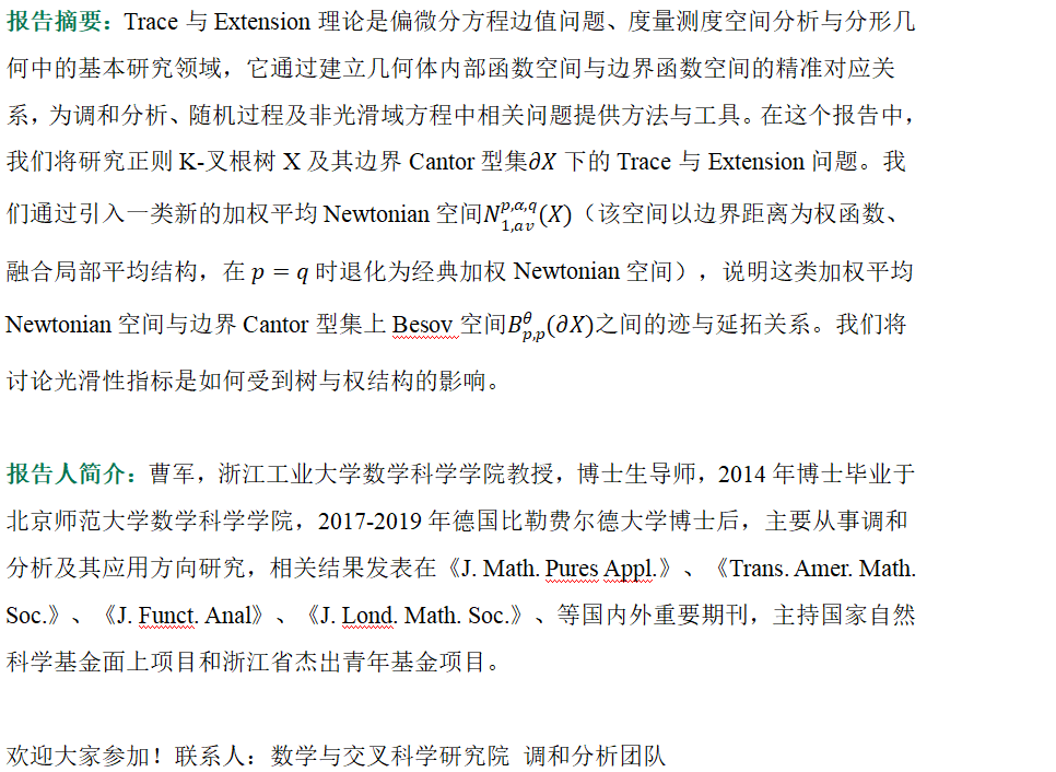 一、报告题目:Trace and Extension Theorems for Weighted Averaged Newtonian Spaces on Regular Trees